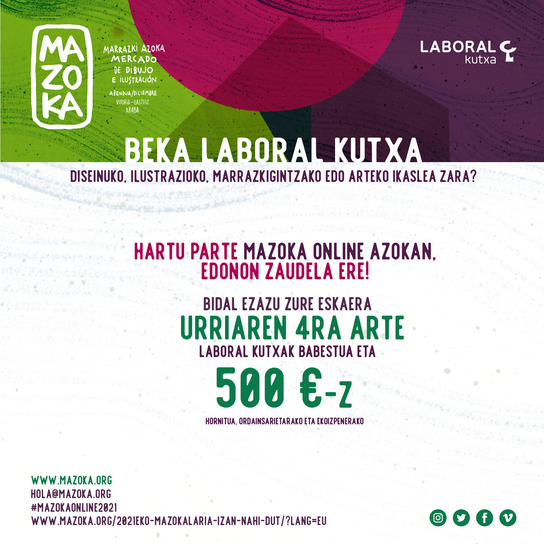 Laugarren urtez jarraian, jasotzen diren eta 2020-2021 edo 2021-2022 ikasturtean diseinuko, ilustrazioko, animazioko, marrazkigintzako edo arteko ikasle izatea ziurtatzen duten eskaeren artean, MAZOKALARI BAT hautatuko da, banakoa edo taldekoa. “bekikasle” Laboral Kutxa BEKAren irabazleak 500 € eramango ditu, ordainsarirako eta obra-ekoizpenerako.